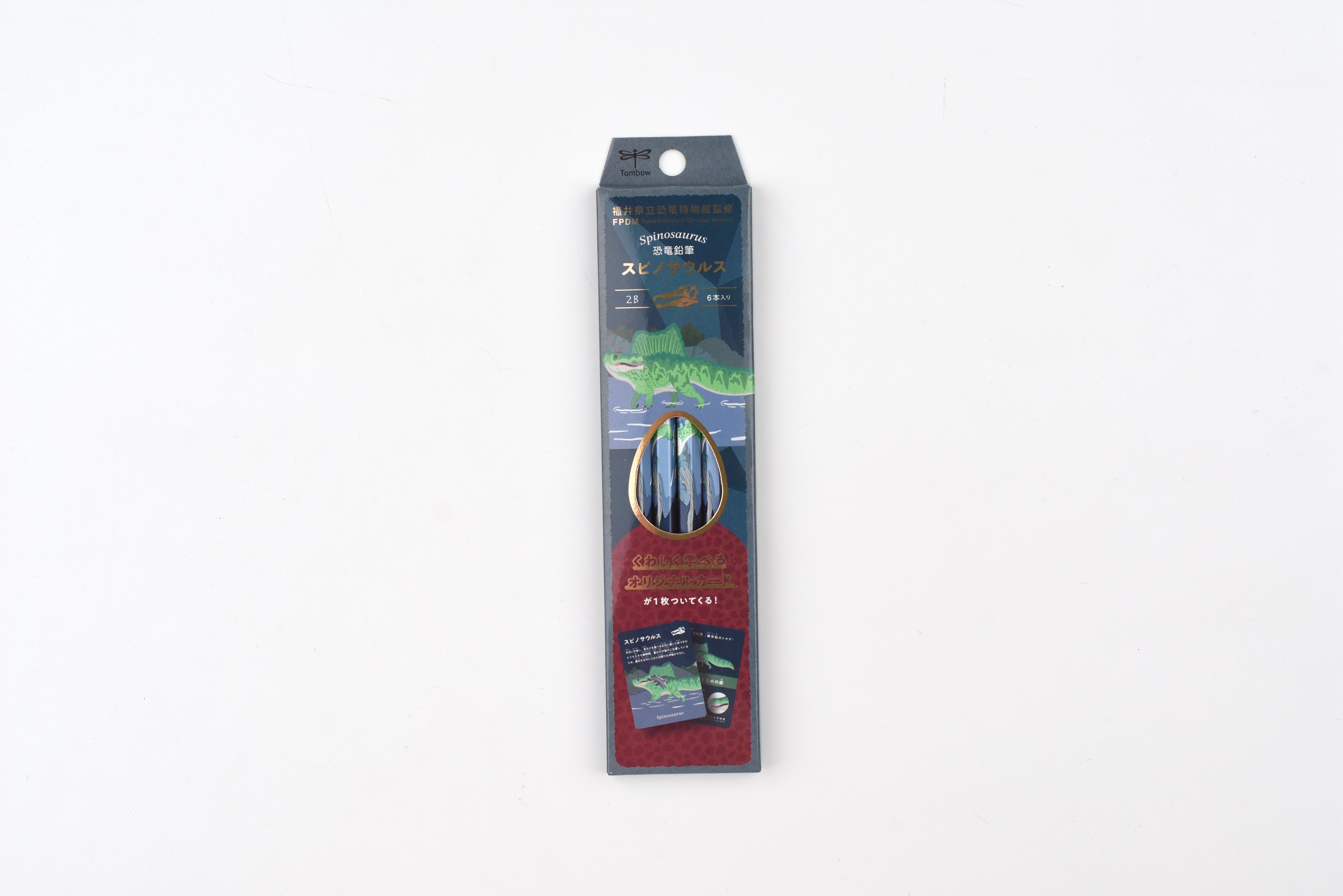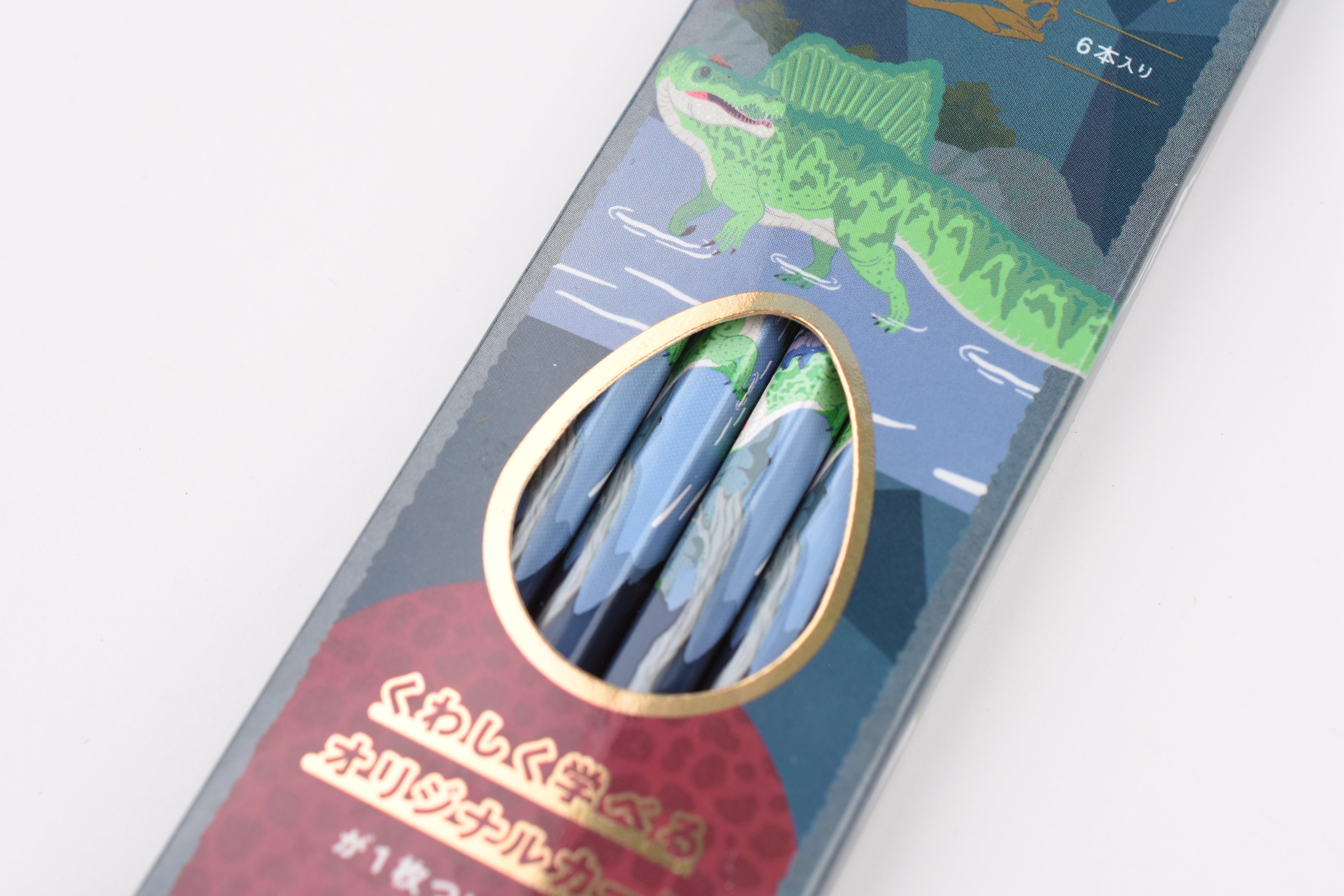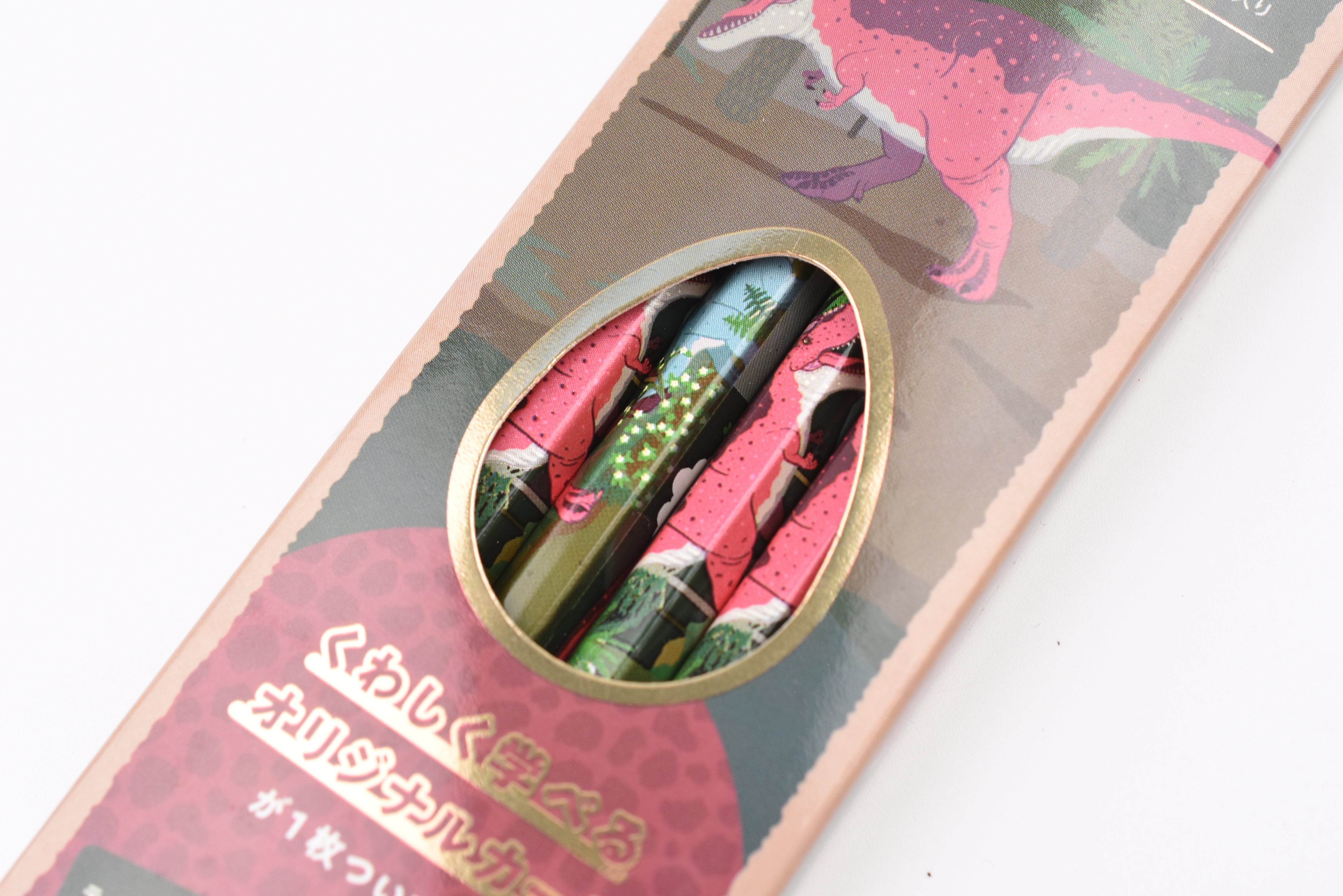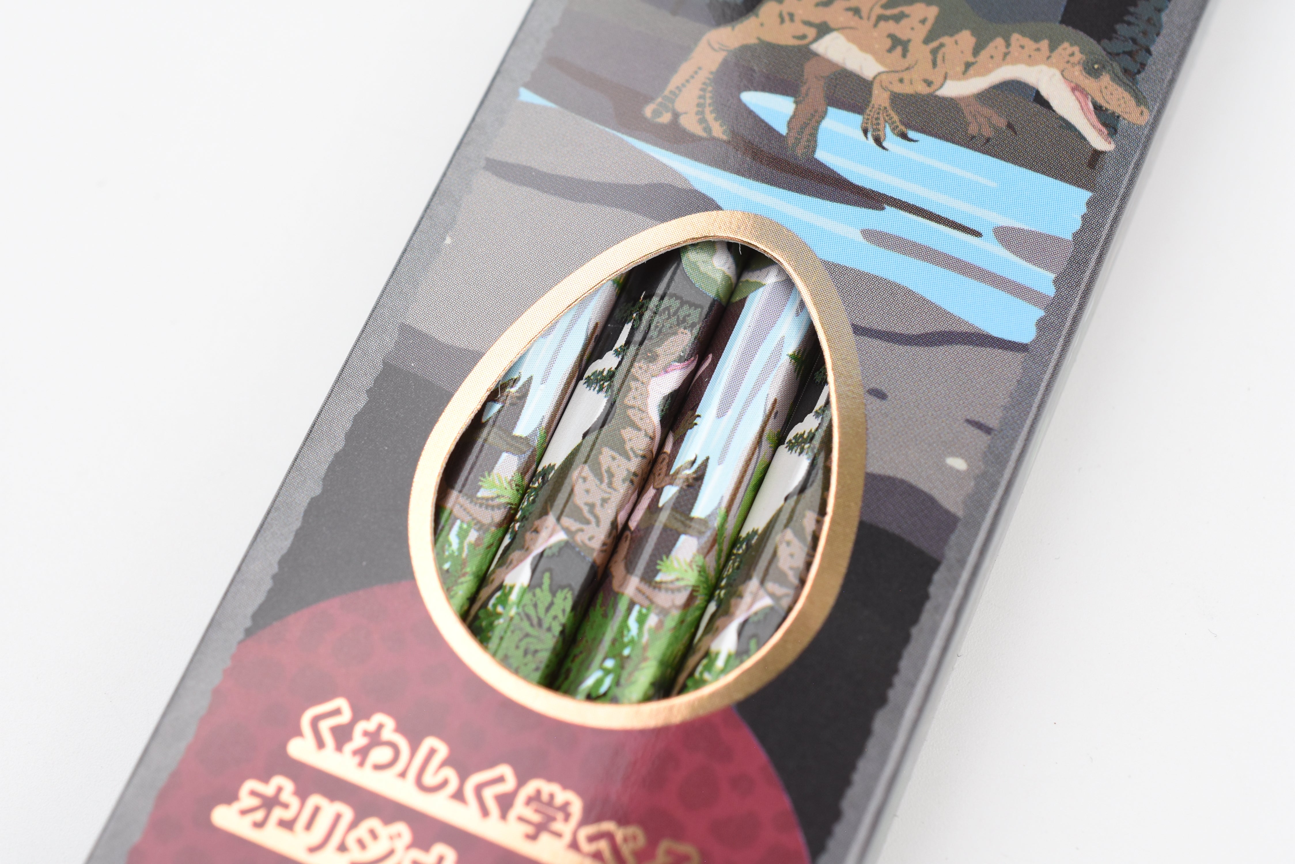 Tombow Dinosaur Pencils are a limited-edition set of school pencils featuring four eye-catching dinosaur designs. Each pencil is printed with pearlescent, wrap-around illustrations and is topped with a silver dinosaur skull motif. Supervised by the renowned Fukui Prefectural Dinosaur Museum and illustrated by artist KEITA, the set includes popular prehistoric favorites such as the Fukuiraptor, Spinosaurus, Tyrannosaurus, and Triceratops in classic 2B hexagonal shafts.