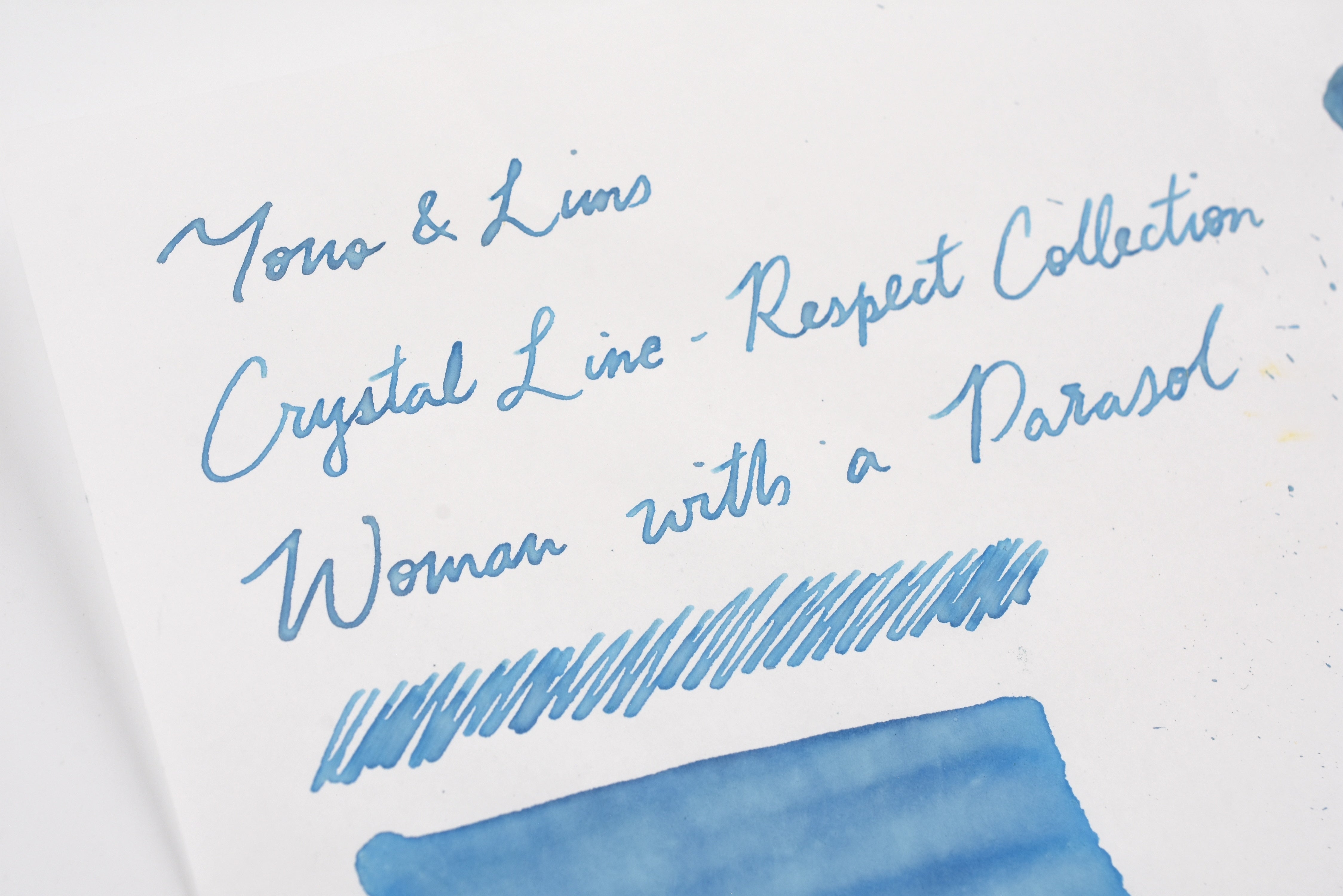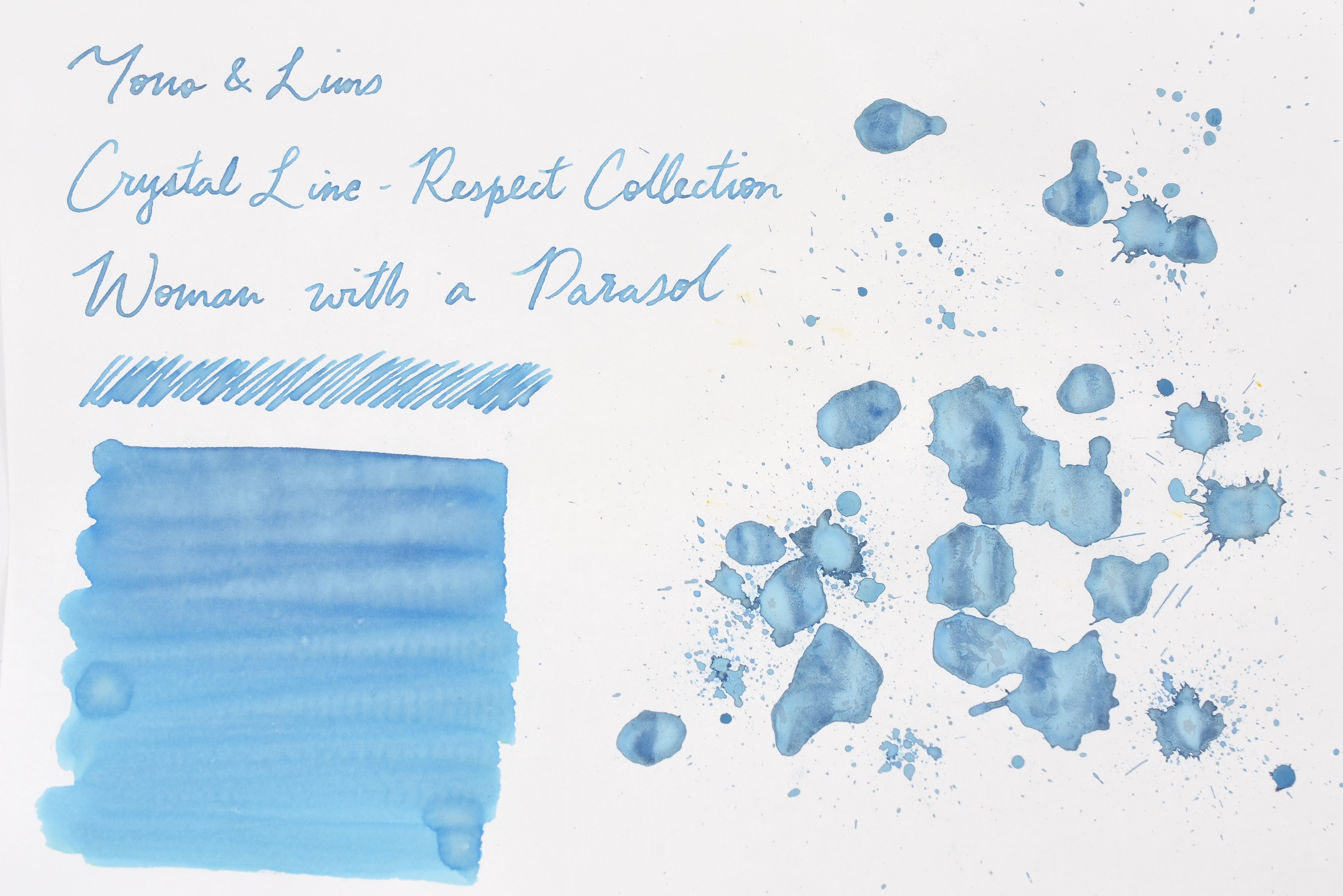 The Respect Collection is created to pay homage to the art masterpieces. The vibrant colors derived from these paintings or sculptures are compressed into a single-bottled ink. In order to create a unique blending effect from different hues, multiple colors of pigment powder are added into the ink. Inspired by painting Woman with a Parasol by Claude Monet, this is a blue-based ink with white, purple and green pigment particles. Based on the properties of this ink, it is recommended to use it with dip pens or glass pens only.