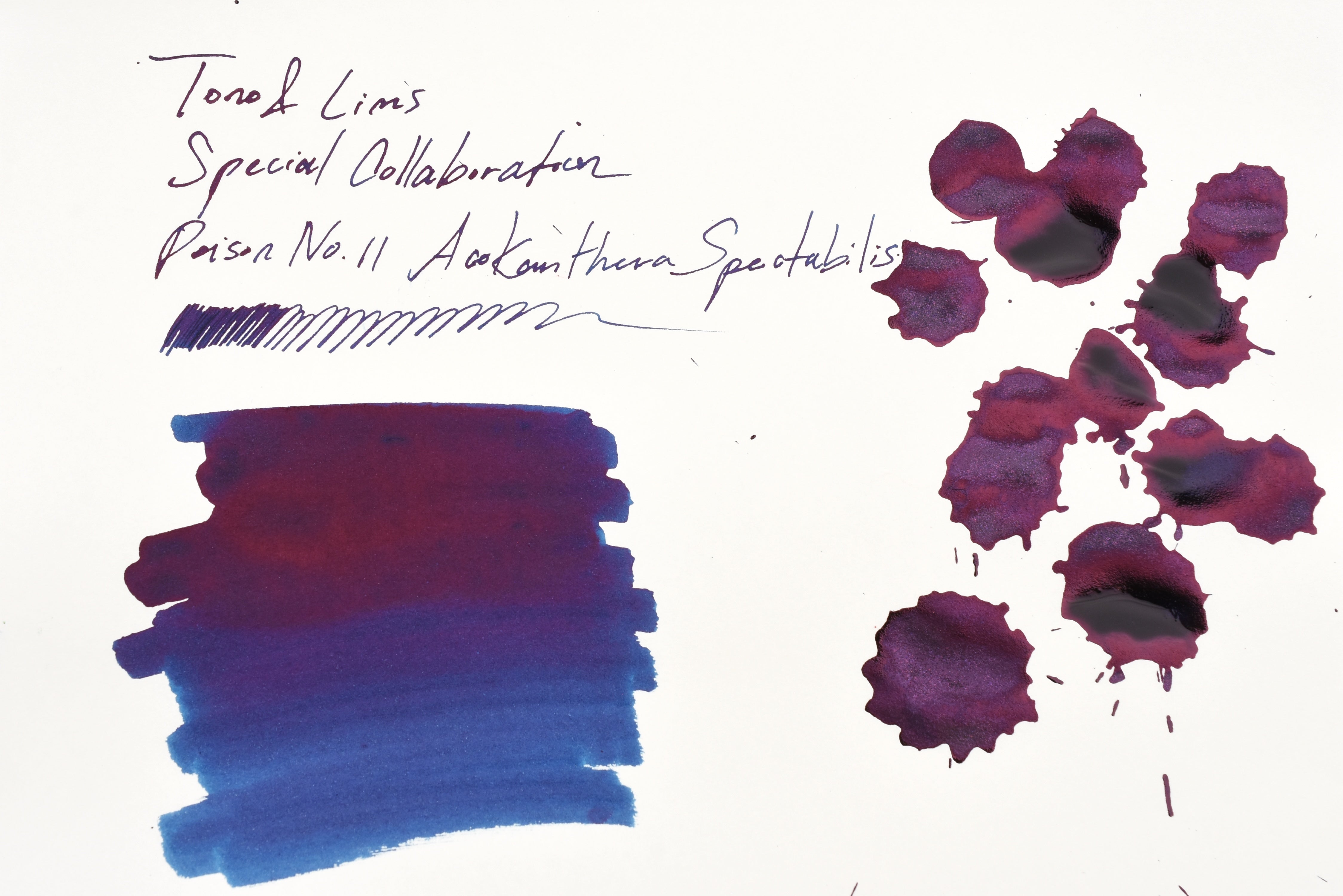"Do not let your fountain pens drink this ink! It's poisonous!" Being the highest and most viscous amount of shimmer particles added into an ink in the history of Tono & Lims, the Poison and Toxin collection is produced only for glass pen use. Inspired by the vibrant colors in nature that serve as a warning to predators, these ink colors are named after poisonous plants, venomous animals, or different types of toxins.