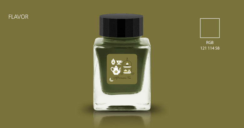 Afternoon Tea is an olive green, scented ink in the Adult Night series with a fragrance reminiscent of floral tea. The Adult Night Line is a series of alluring fountain pen inks inspired by a fun night out for grown-ups. You may find interesting themes such as coffee, cigar or more in this collection, and some even come with a pleasant scent that enriches your writing experience.