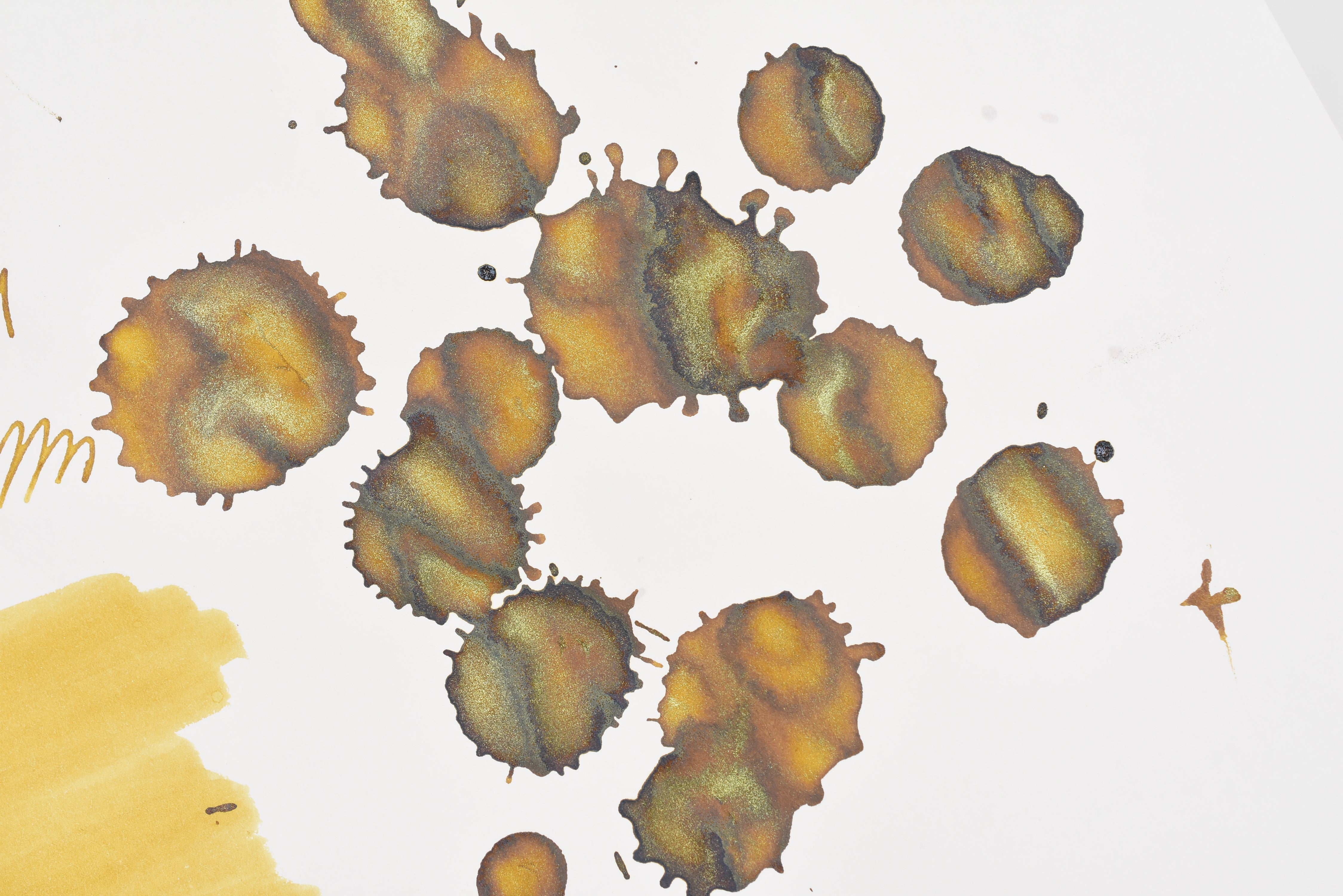 swatching the ink - it's very rich...like a brown w/some green shimmer. In my Kakimori amber - it writes much lighter. A golden/ bronze - that's easily legible. the shimmer even shows up with the fine nib. Nice flow more wet than dry, but not super wet. rather intriguing ink.