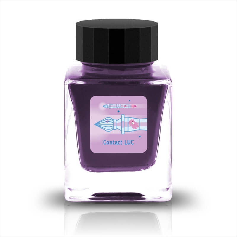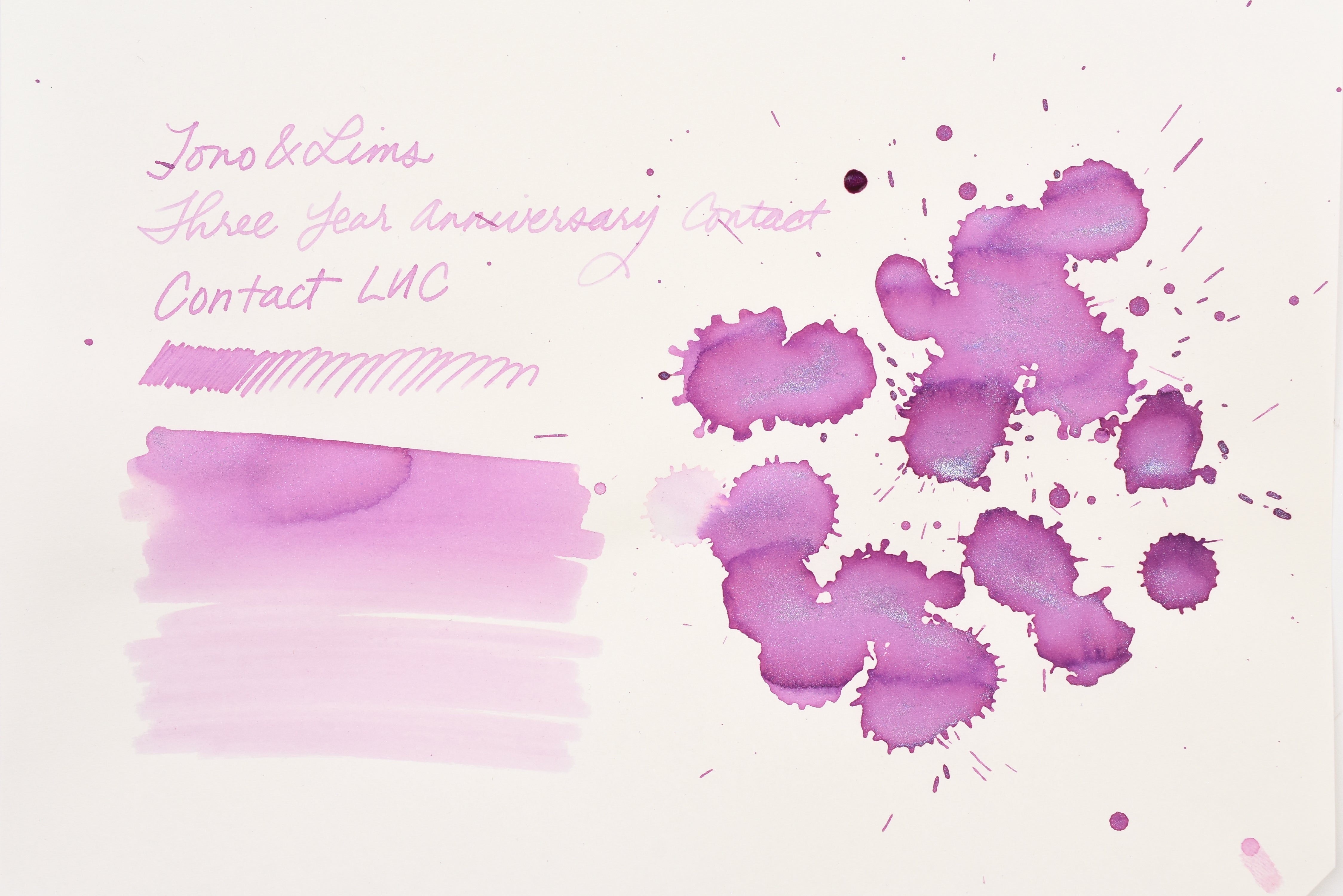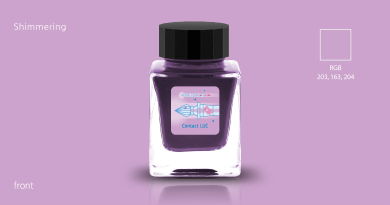 The Three Year Anniversary Contact Collection inks come in rich and vibrant colors, smooth writing quality, and with interesting properties like shimmer or scent. Super inks contain iridescent shimmer particles that shift color depending on the angle of the light. Scented inks are more likely to feather when depositing a large amount of ink. Please make sure to use fountain pen friendly paper for best results with these scented inks.