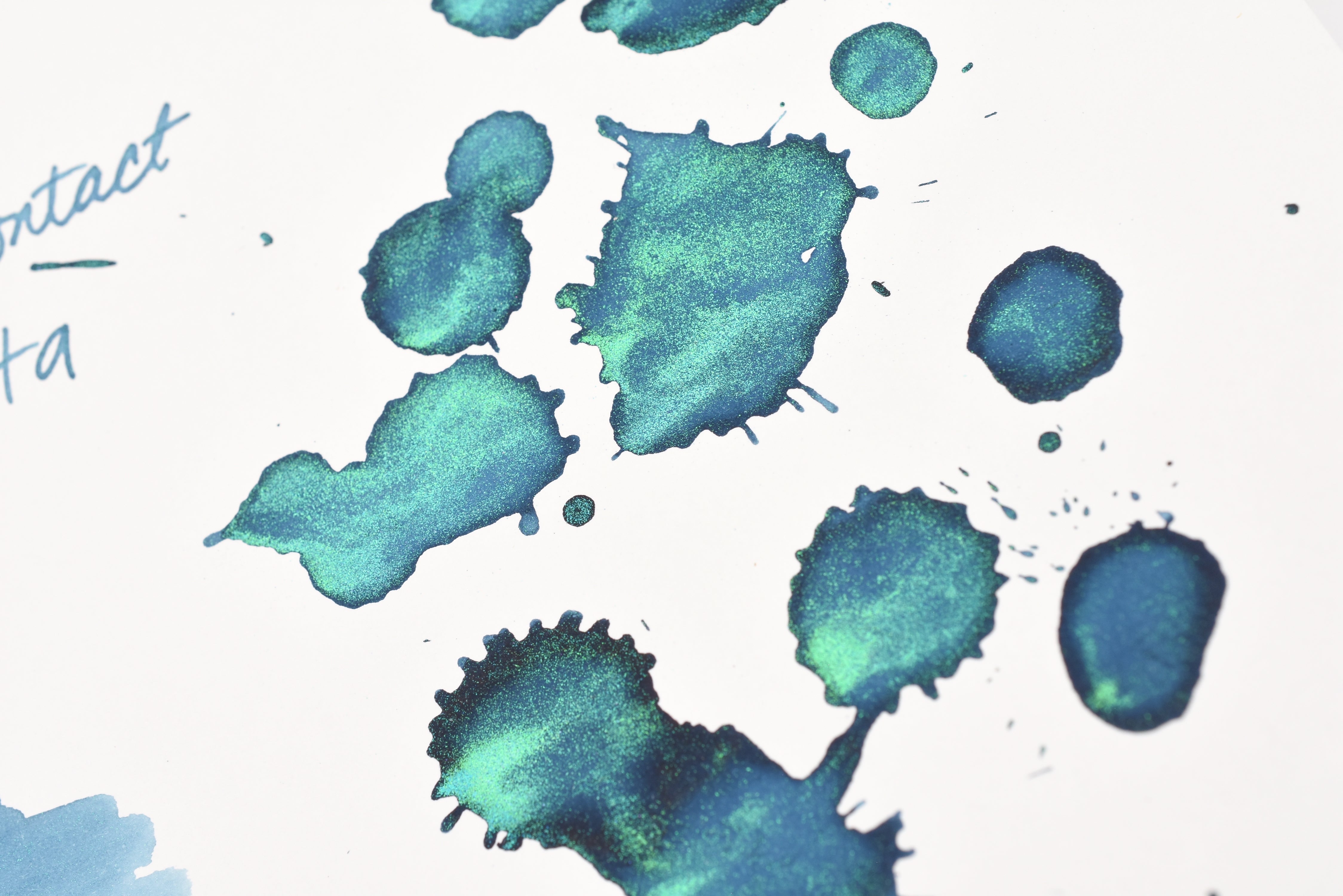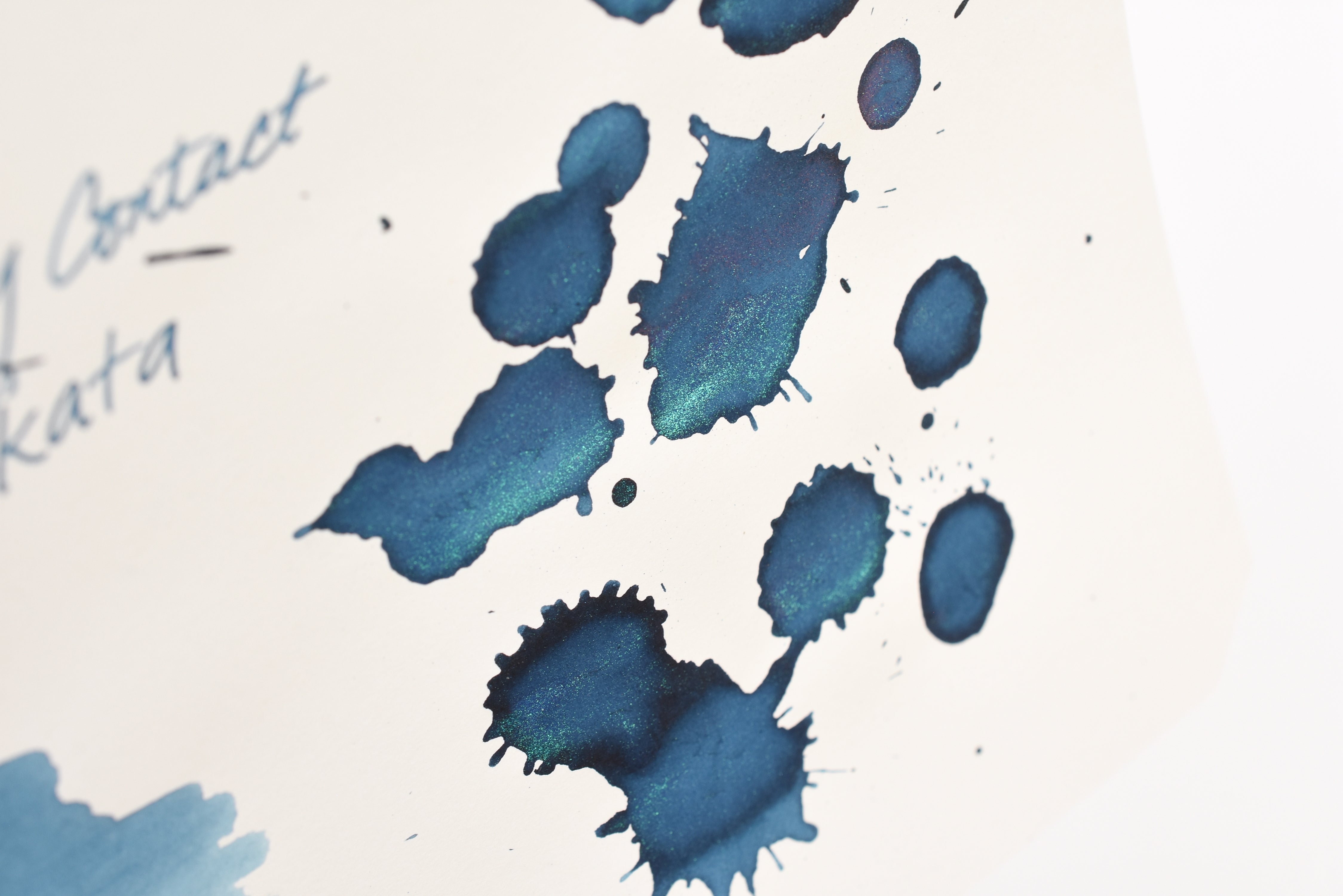 The Three Year Anniversary Contact Collection inks come in rich and vibrant colors, smooth writing quality, and with interesting properties like shimmer or scent. Super inks contain iridescent shimmer particles that shift color depending on the angle of the light. Scented inks are more likely to feather when depositing a large amount of ink. Please make sure to use fountain pen friendly paper for best results with these scented inks.