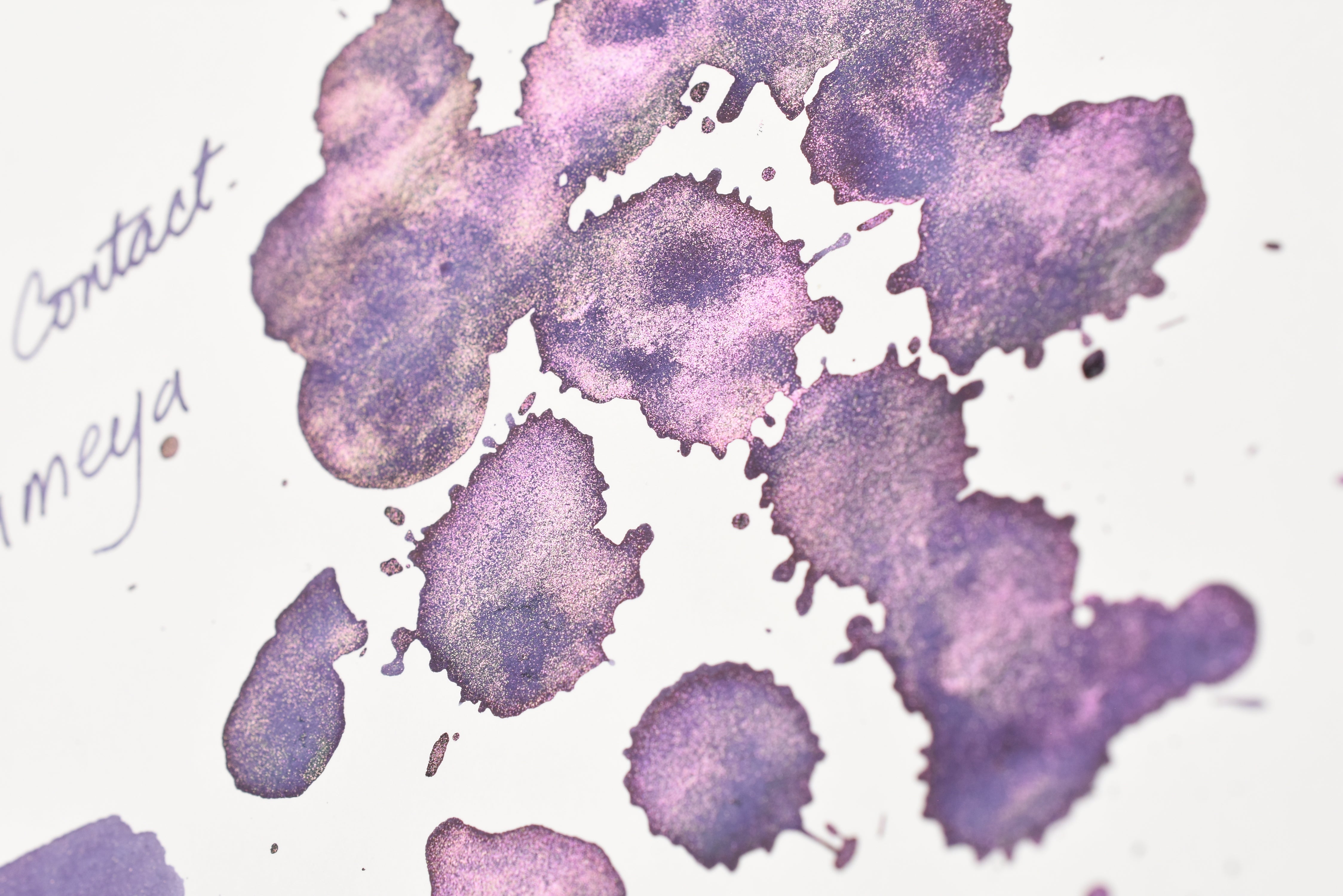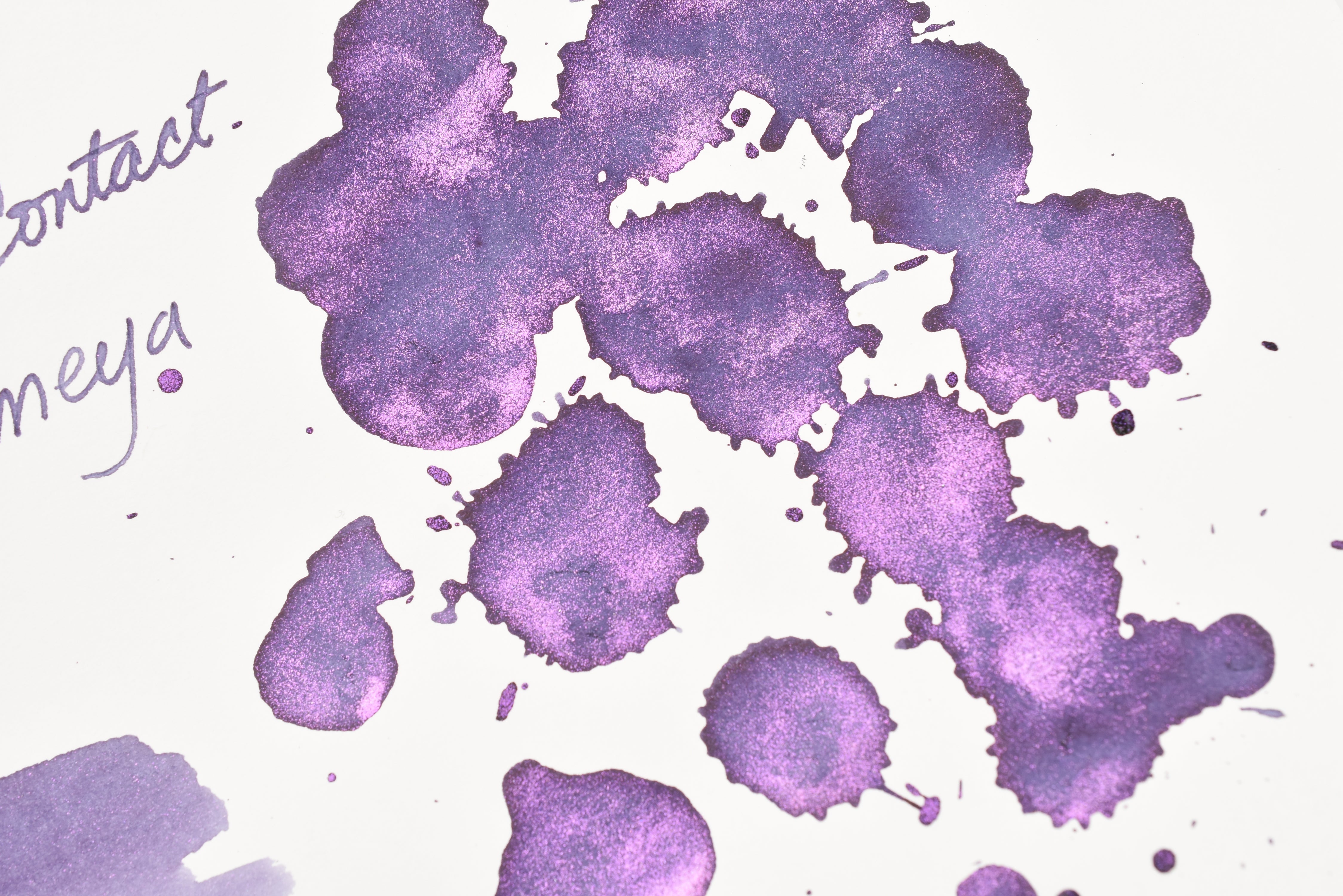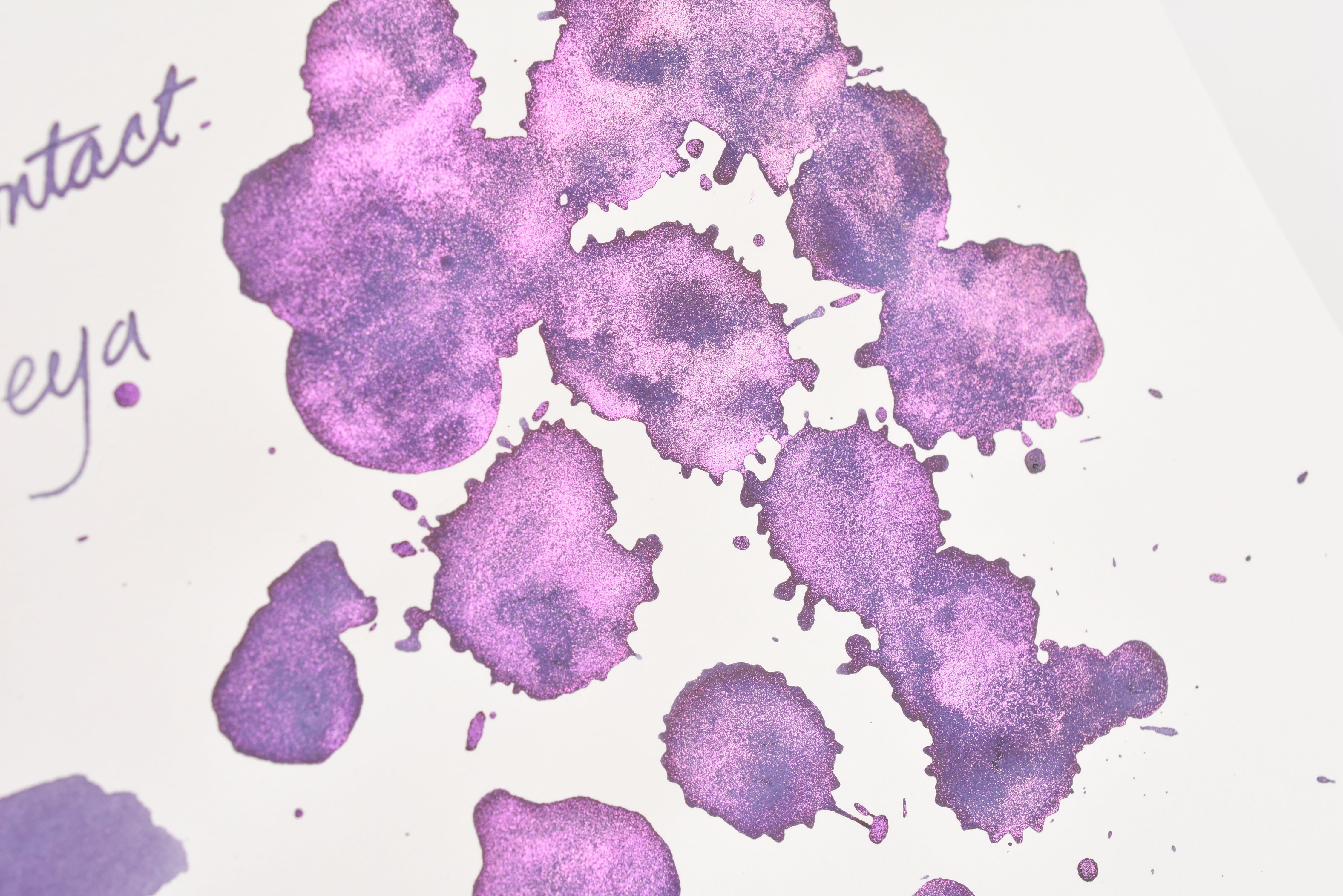 The Three Year Anniversary Contact Collection inks come in rich and vibrant colors, smooth writing quality, and with interesting properties like shimmer or scent. Super inks contain iridescent shimmer particles that shift color depending on the angle of the light. Scented inks are more likely to feather when depositing a large amount of ink. Please make sure to use fountain pen friendly paper for best results with these scented inks.