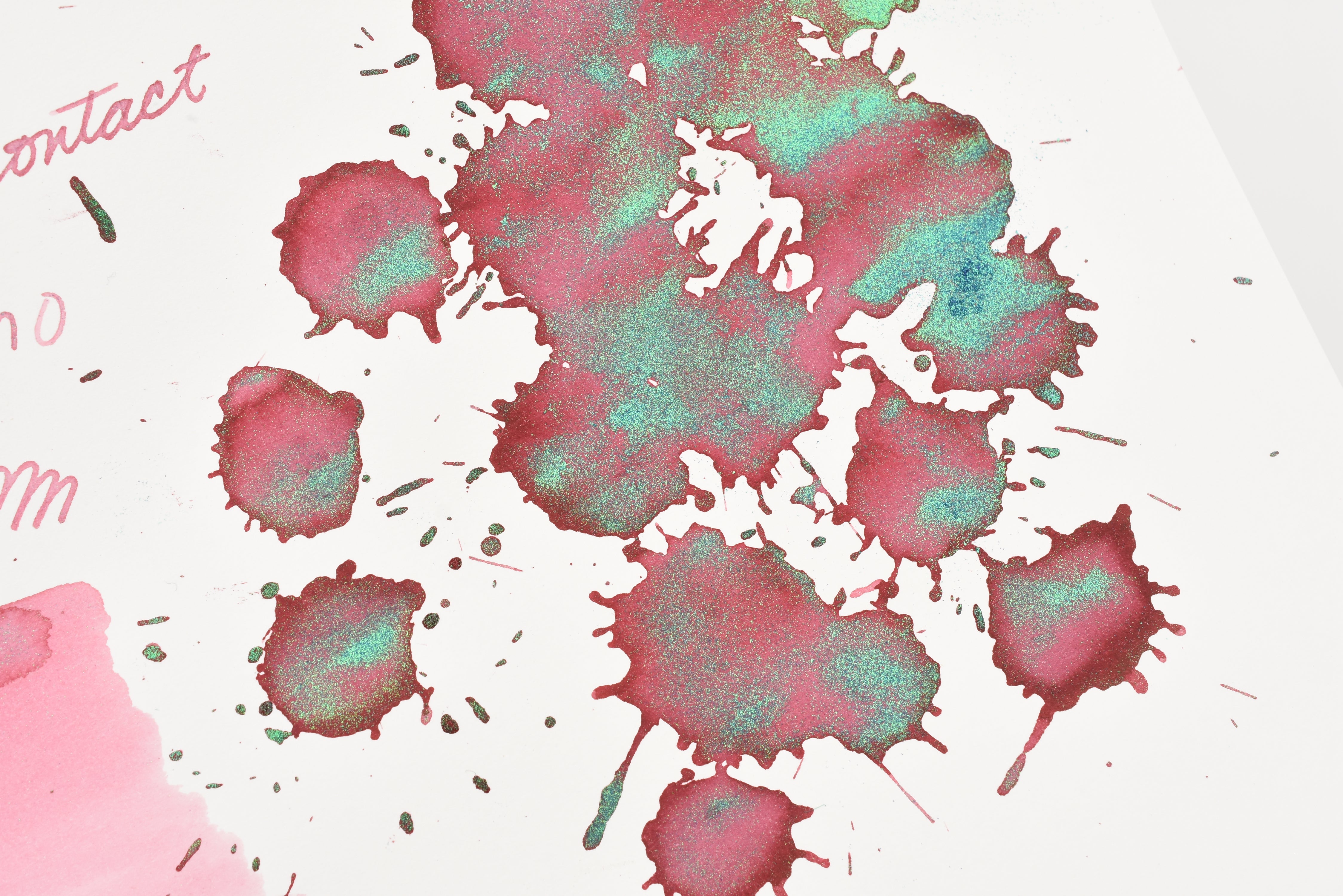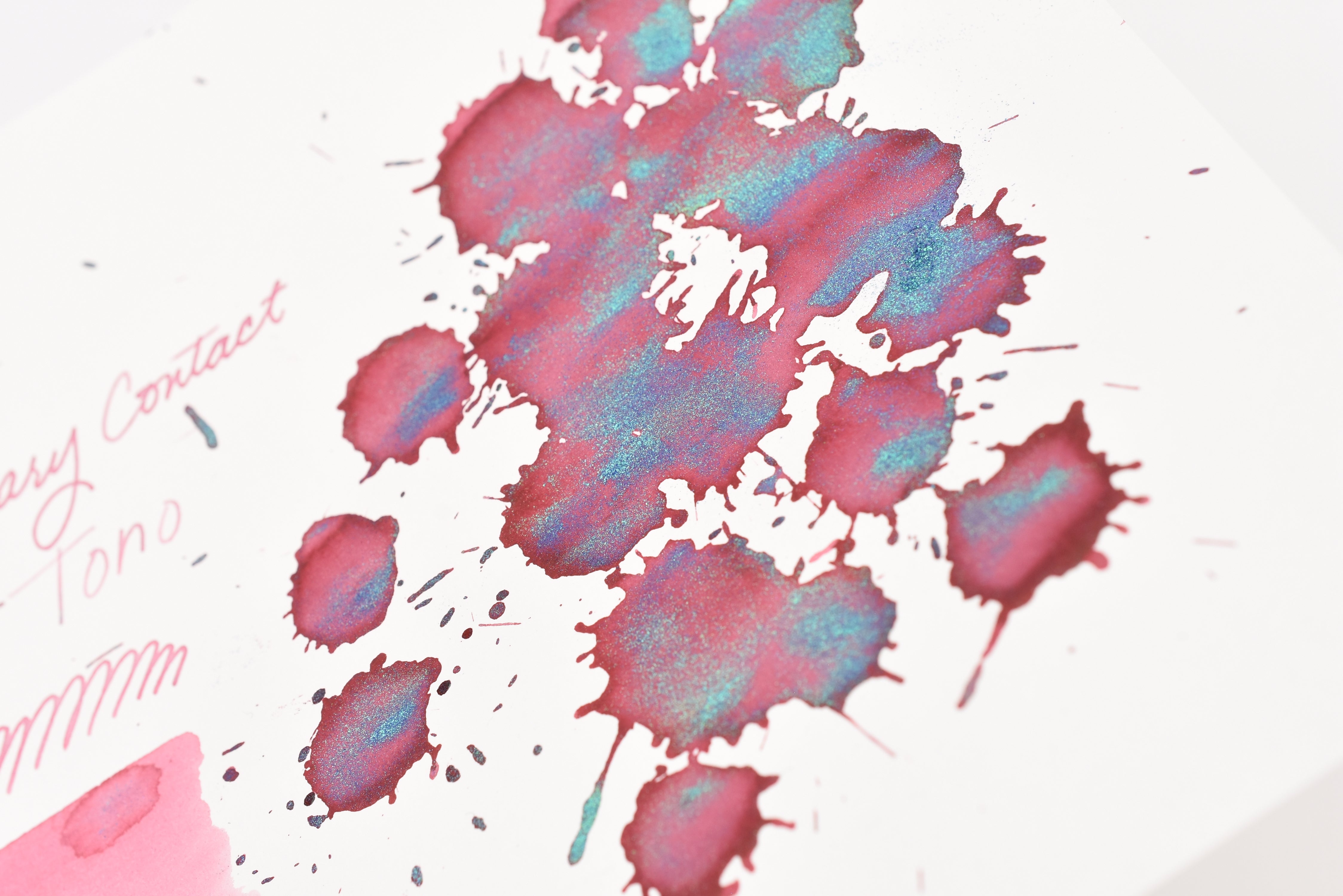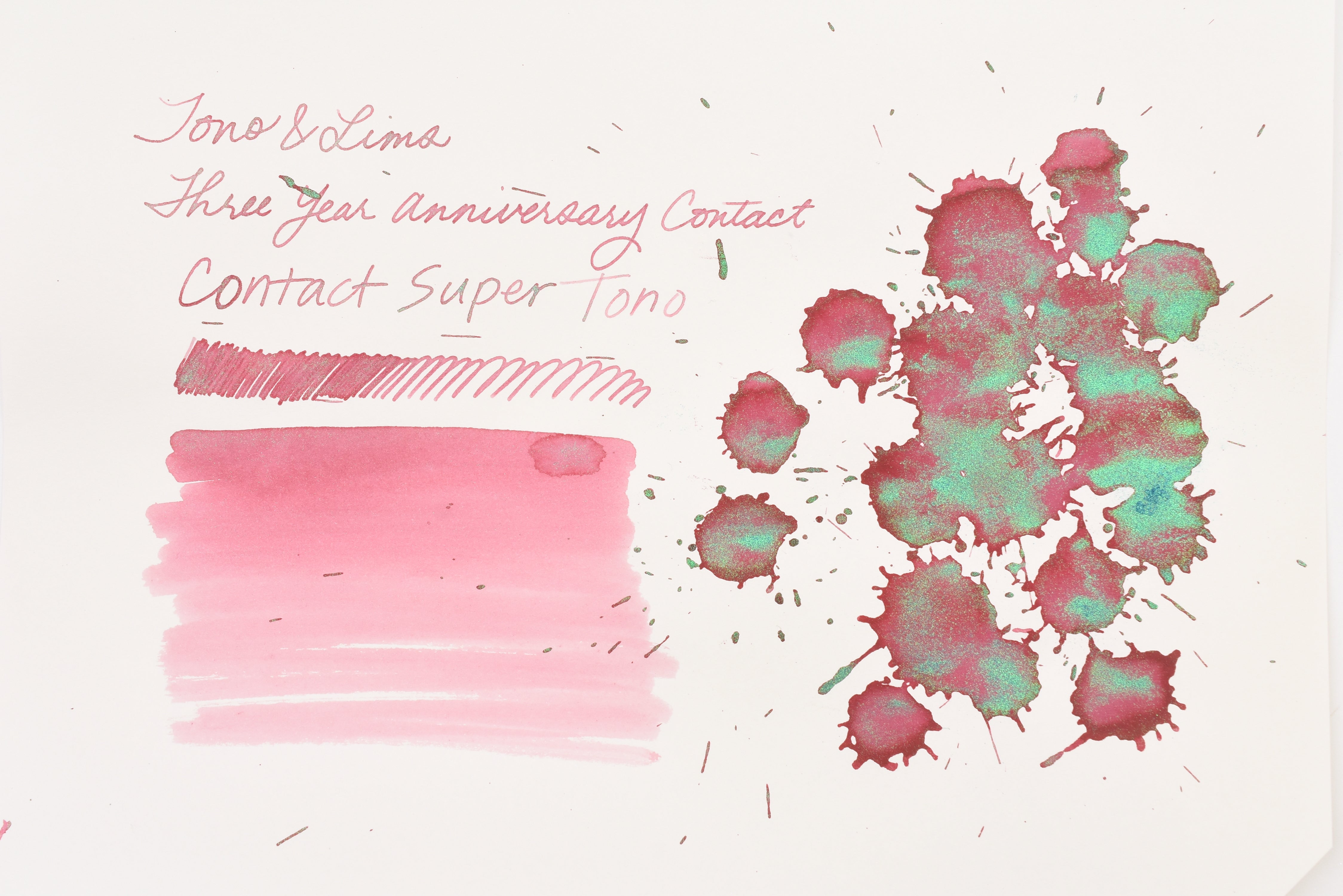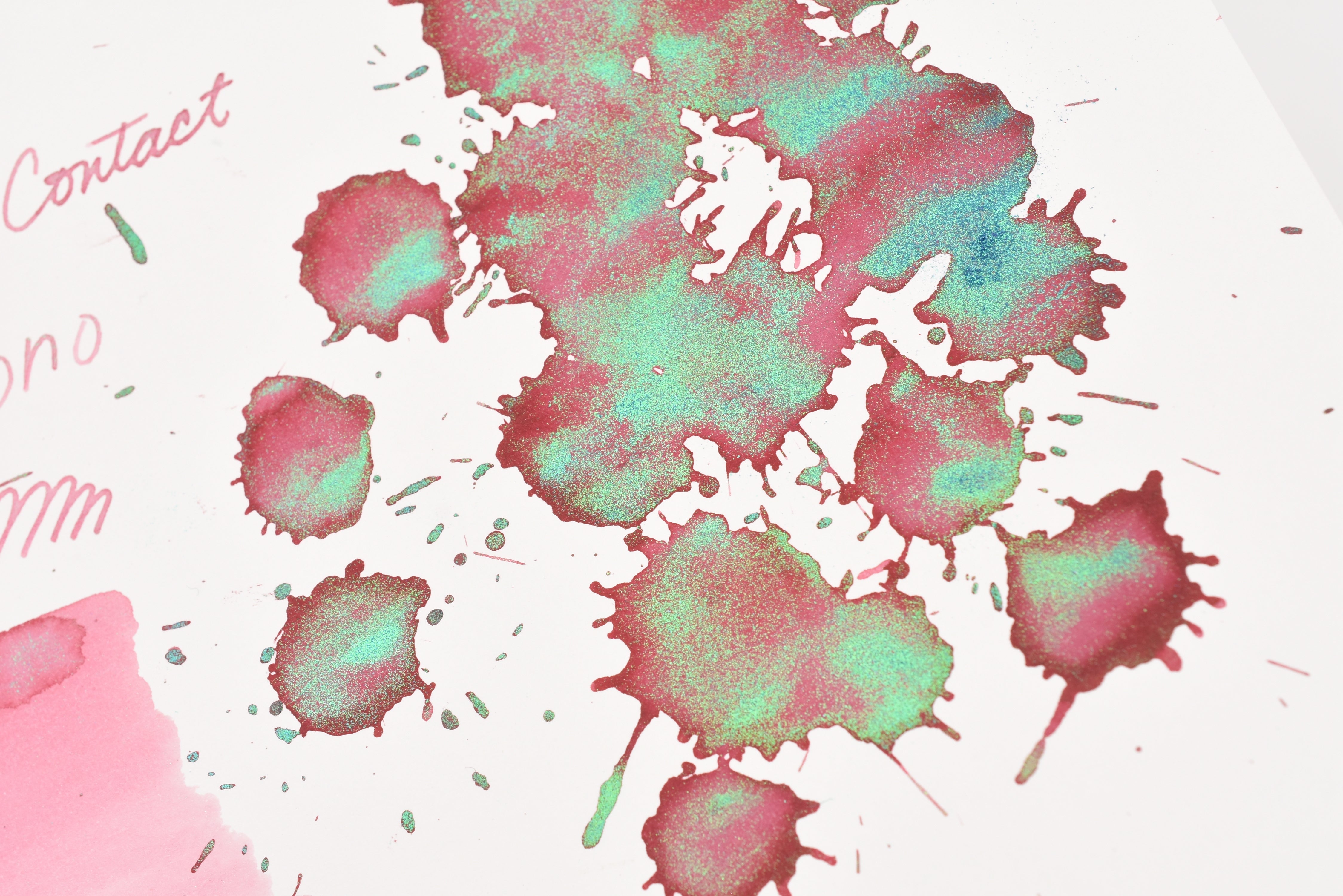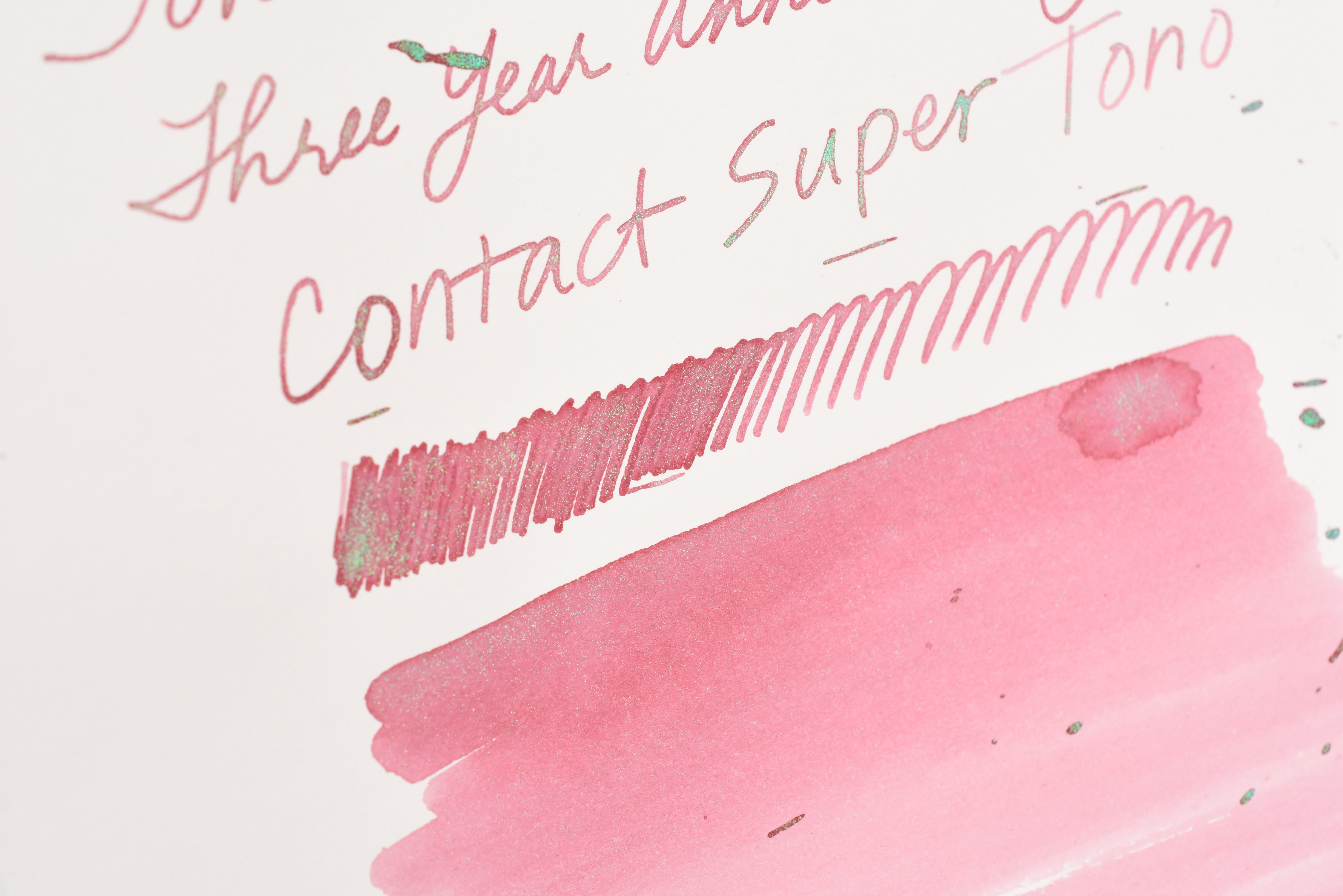 The Three Year Anniversary Contact Collection inks come in rich and vibrant colors, smooth writing quality, and with interesting properties like shimmer or scent. Super inks contain iridescent shimmer particles that shift color depending on the angle of the light. Scented inks are more likely to feather when depositing a large amount of ink. Please make sure to use fountain pen friendly paper for best results with these scented inks.