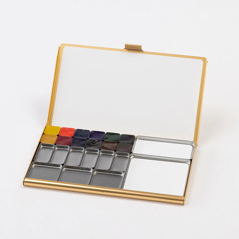 This Folio Palette is twice the size of the standard Pocket Palette, offering watercolor enthusiasts ample space for more colors while maintaining the convenience of painting anywhere. It fits just right in a Regular size Zipper Case. The palettes are available in a limited bronze color with Traveler's Travel and Sketch logo. It comes with a screen-printed cloth drawstring pouch, featuring the TRAVEL & SKETCH logo, perfect for storing your palette and small accessories.