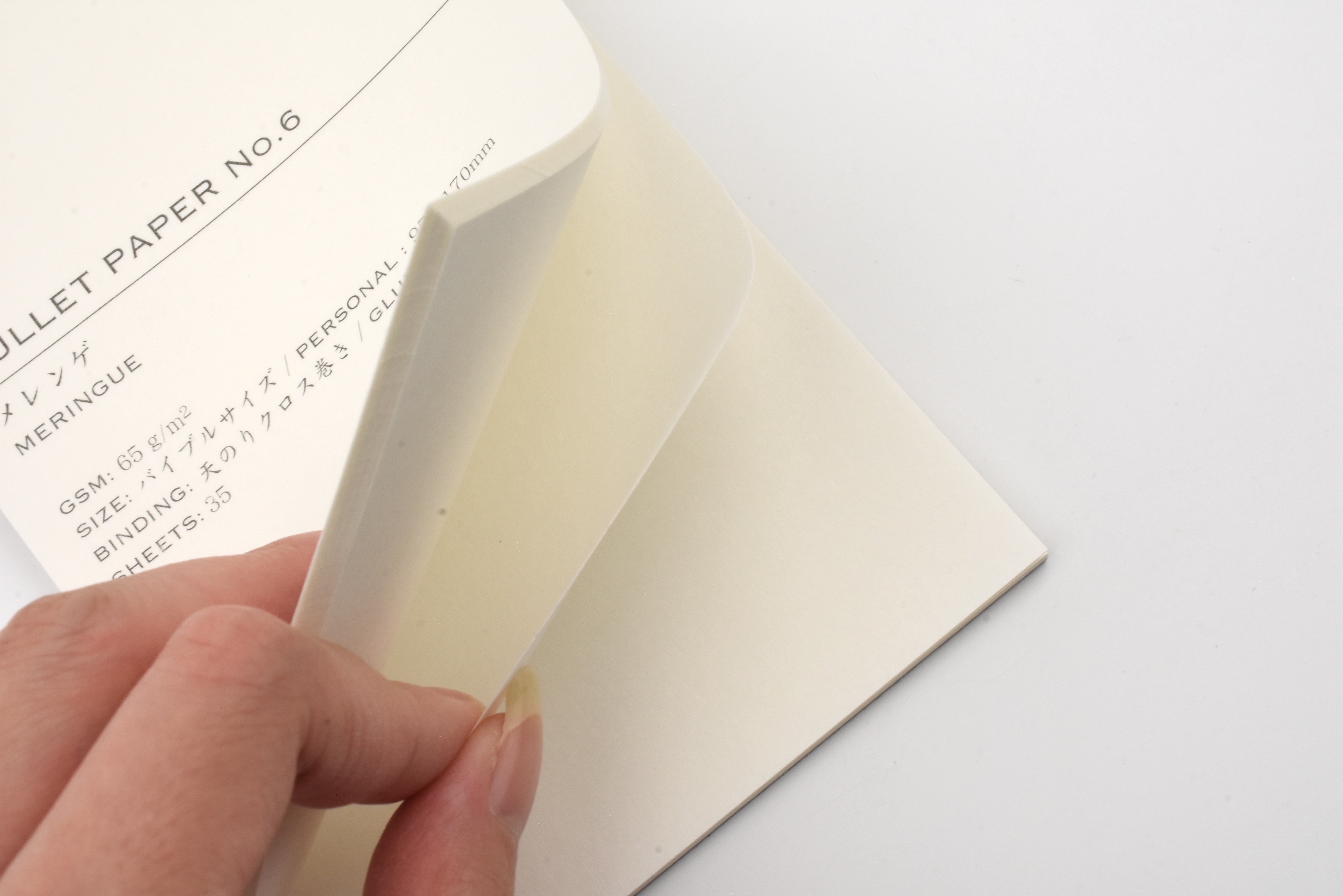 Meringue is a bulky, high-whiteness book paper that balances thickness, lightness, and just the right stiffness. Originally developed for publishing, it’s easy to flip through and write on, offering a pleasantly rough texture that absorbs ink well without bleeding. Ideal for everyday writing or creative notes.