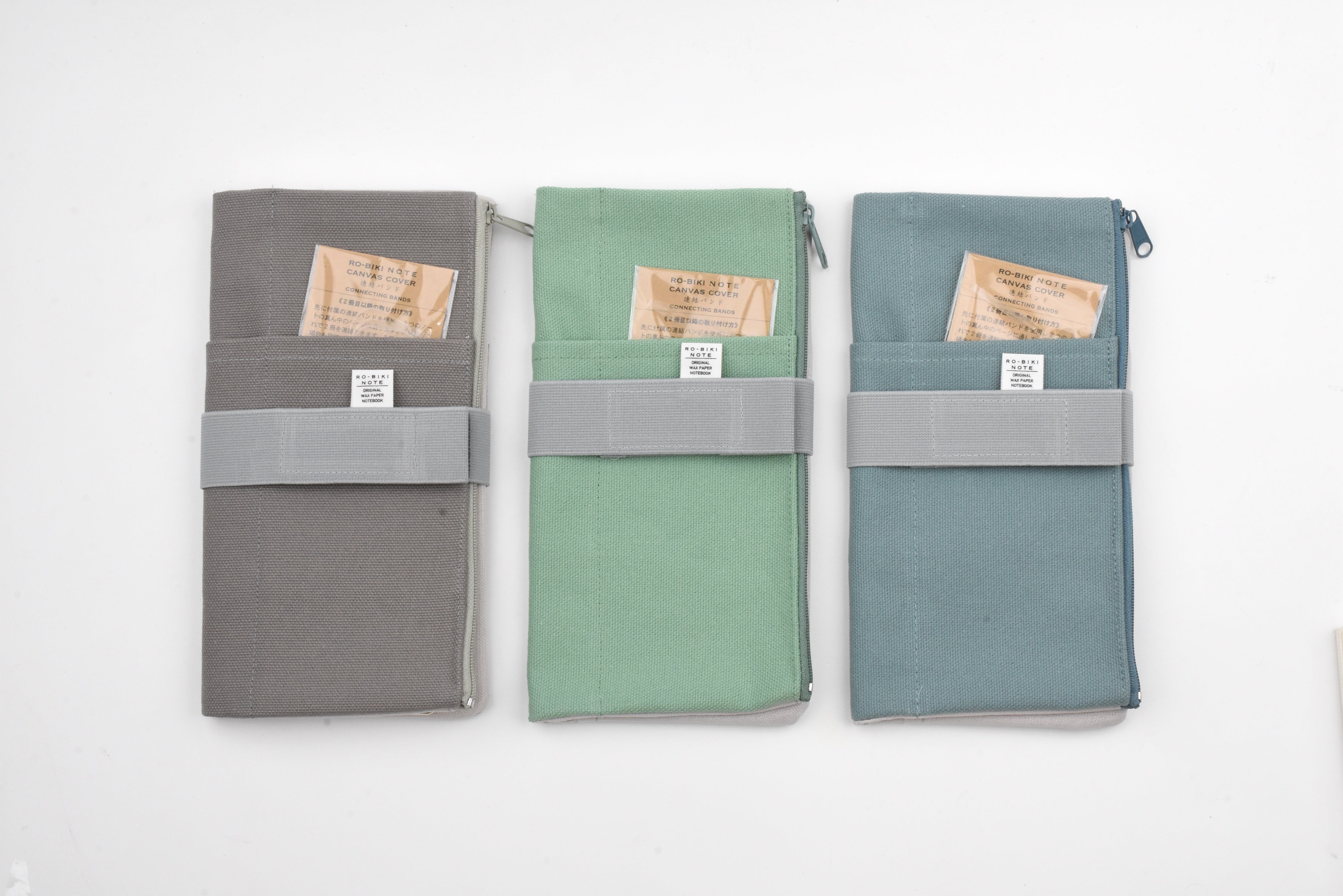 Released in 2010, the Ro-Biki Note series created by Yamamoto Paper features slim, conveniently sized notebooks with elegant waxed paper covers and cream-colored paper. These Ro-Biki Note Canvas Covers make it possible to protect and carry multiple Ro-Biki Notes at once, along with pens, pencils, and other stationery essentials--ideal for everyday carry or travel journaling.
