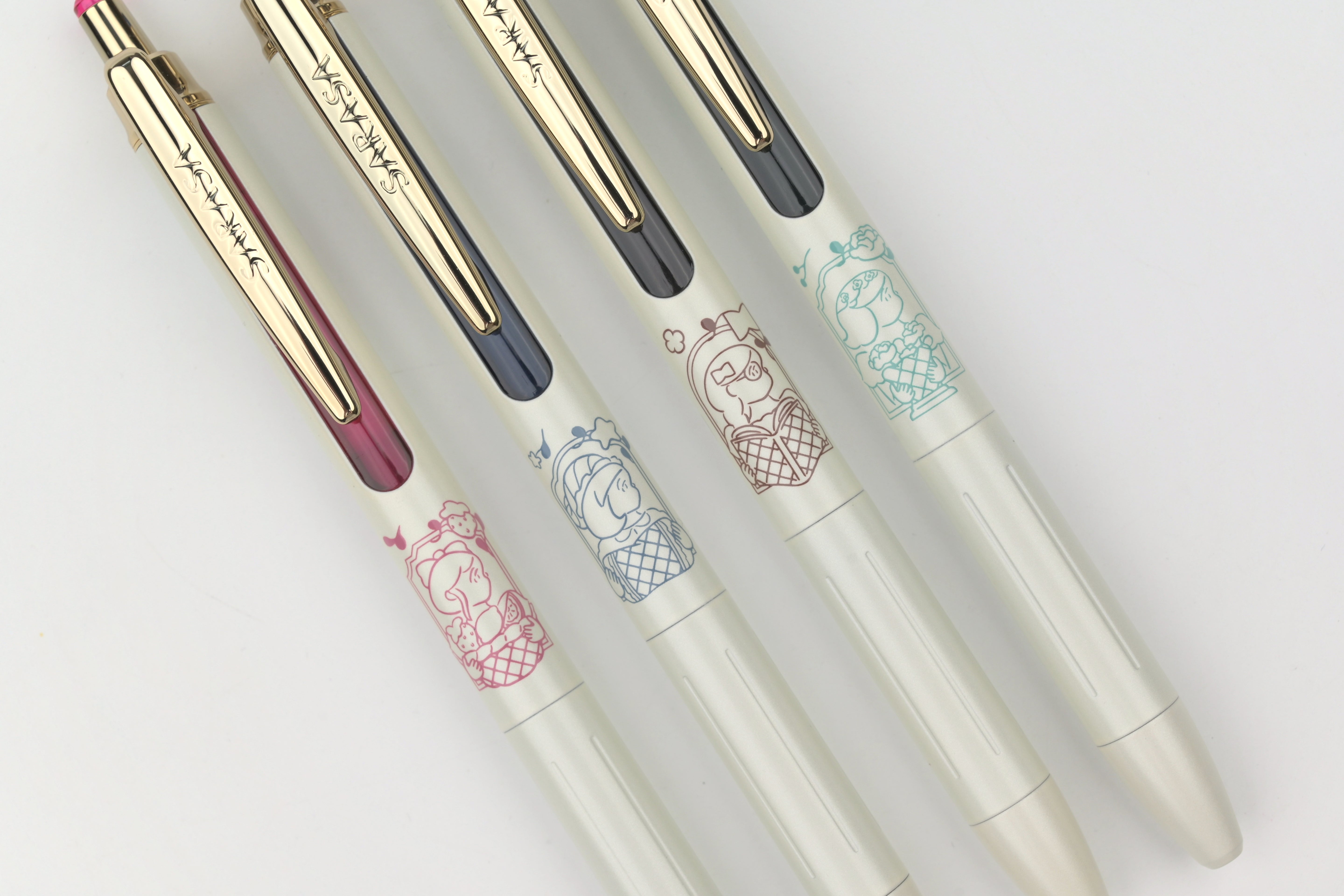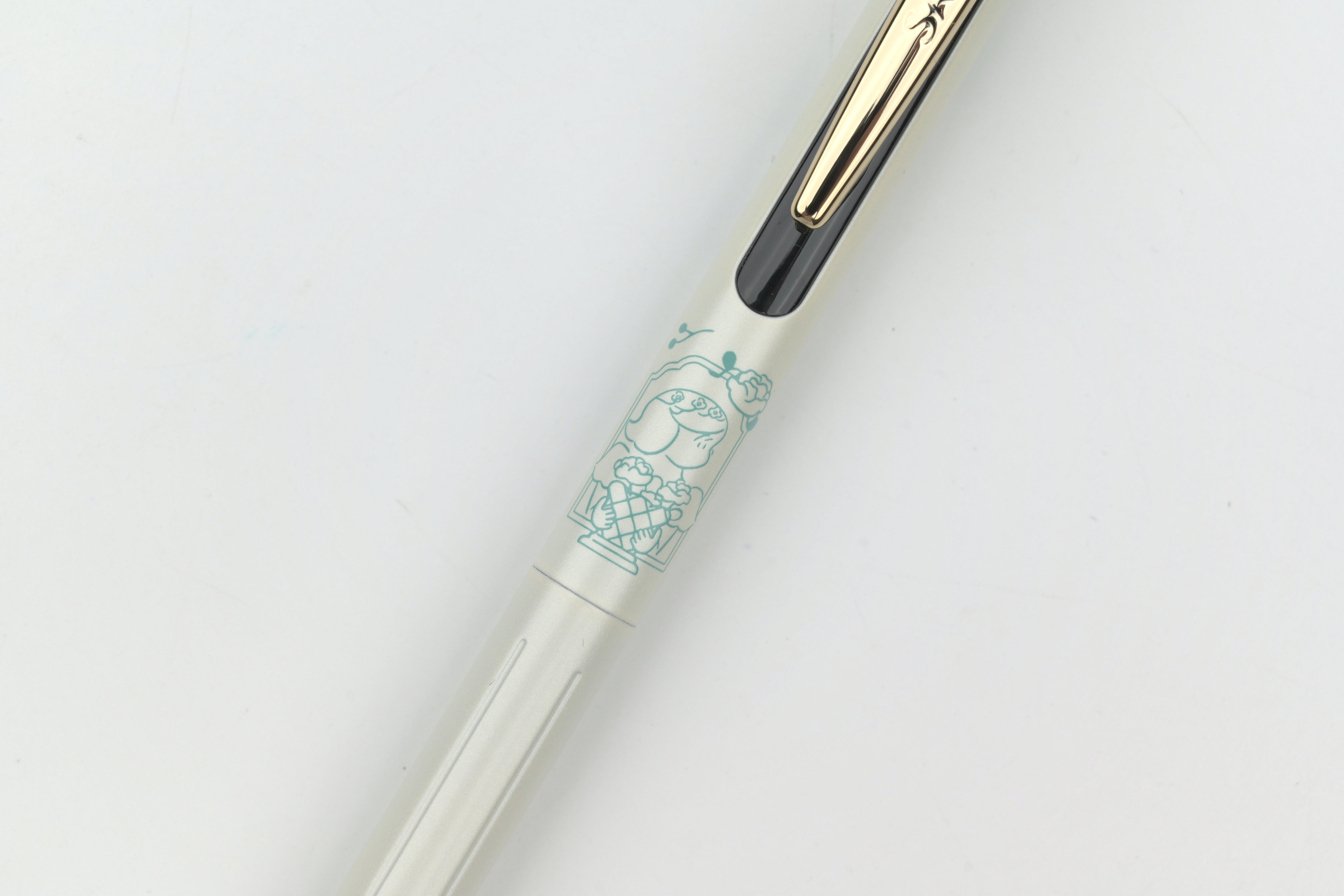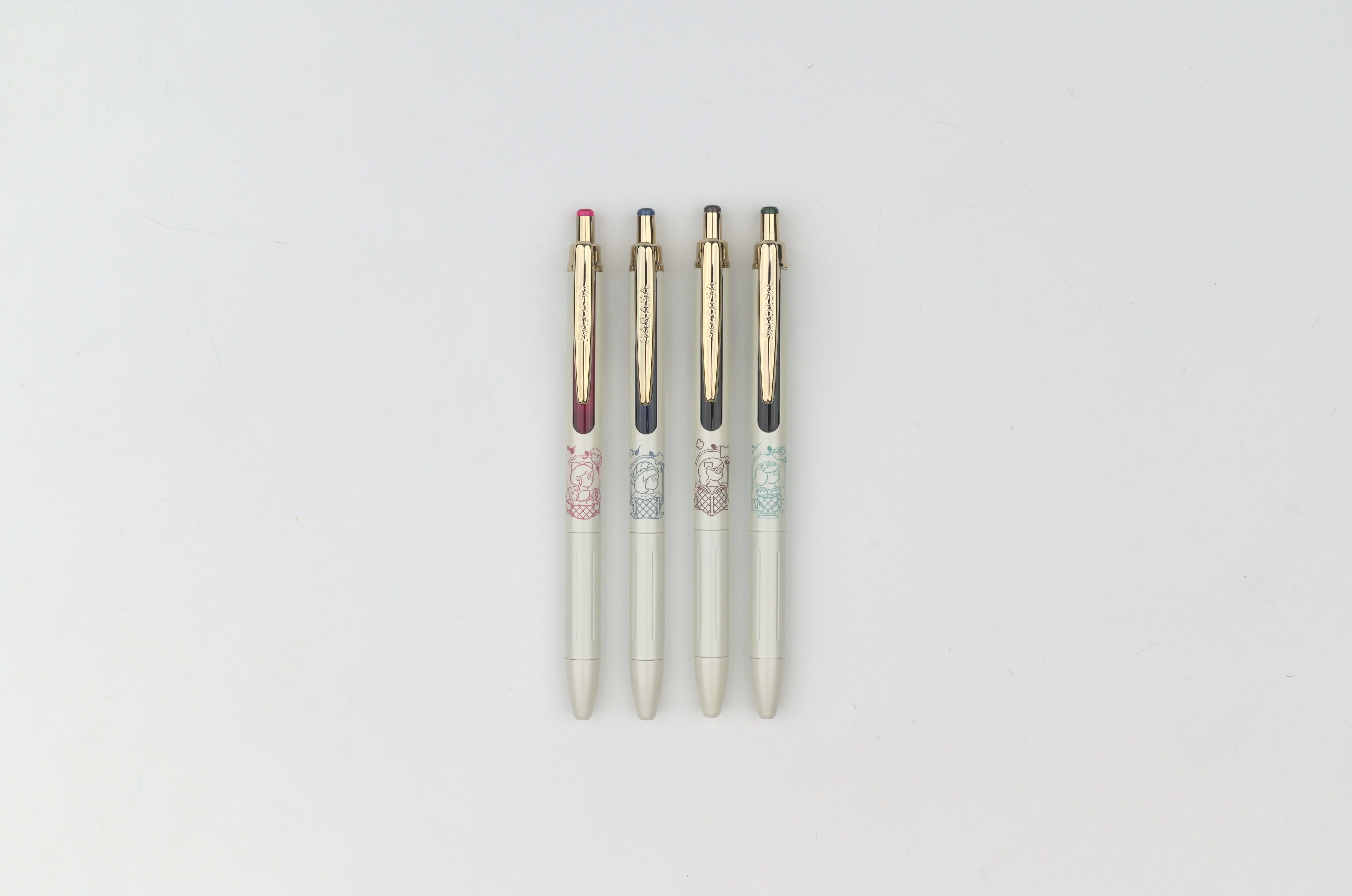 A collaboration between Zebra and illustrator Heisuke Kitazawa, these limited edition “My Little Joy” pens pair softly colored, storybook-like illustrations with a clean white barrel that beautifully highlights the artwork. Each design features a unique illustrated character, while the gold clip and vintage-toned inks bring a refined, luxurious feel. Each pen has a different color ink that matches the color accent of the body.